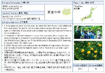 ![]() OGON no mura Co., Ltd. The company sources its Kito yuzu raw materials from its own cultivation and from contracted farmers in the Kito area, and processes them at its own factory in the area. It also plans and develops new products and sells them to stores nationwide. ![]() |