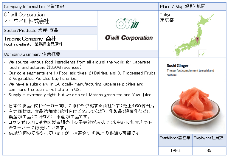 ![]() O’will Corporation We source various food ingredients from all around the world for Japanese food manufacturers ($350M revenues) ![]() ![]() ![]() |