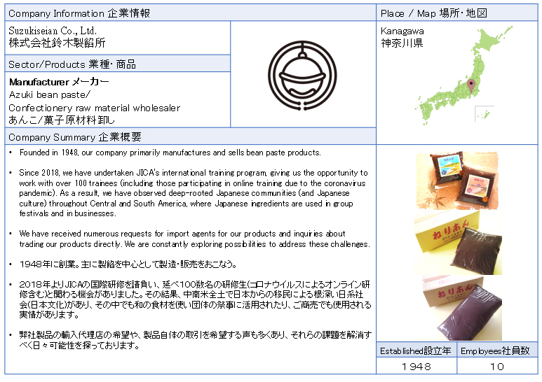 ![]() Suzukiseian Co., Ltd. Founded in 1948, our company primarily manufactures and sells bean paste products.We have received numerous requests for import agents for our products and inquiries about trading our products directly. We are constantly exploring possibilities to address these challenges. ![]() |