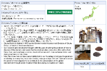 ![]() 中部エコテック株式会社 CHUBU ECOTEC CO., LTD.は、1949年より創業を開始した日本を代表する飼料会社の一つであるCHUBU SIRYO CO., LTD.から始まり、人口密度が高く環境規制の厳しい日本で、密閉縦型発酵処理機を製造しています。 日本では3,700 Unitsの販売実績があり、70%のマーケットシェアを獲得しています。 海外での販売は2010年より実施しており、高温多湿の東南アジアから極寒のロシアまで、導入実績があります。 ![]() |