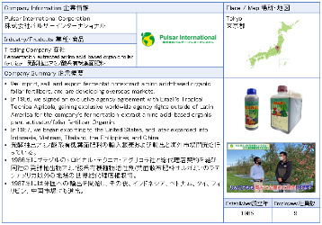![]() 株式会社パルサー・インターナショナル 発酵抽出アミノ酸系有機葉面肥料の輸入販売および輸出と海外市場開発を行っている。1986年にブラジルのトロピカル・テクニカ・アグリコラ社と総代理店契約を結び、同社の発酵抽出物アミノ酸系有機植物活性剤/葉面散布肥料オルガミンのラテンアメリカ以外の地域の世界総代理店権取得。1987年には米国への輸出を開始し、その後、インドネシア、ベトナム、タイ、フィリピン、中国市場にも進出。 ![]() |