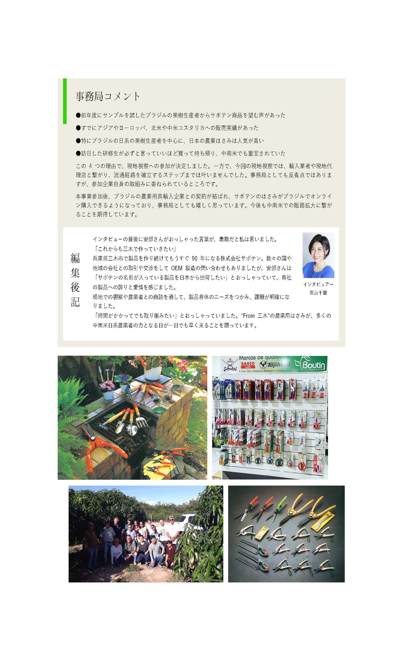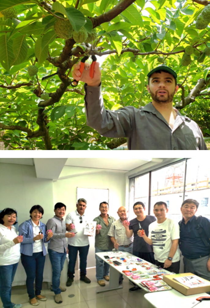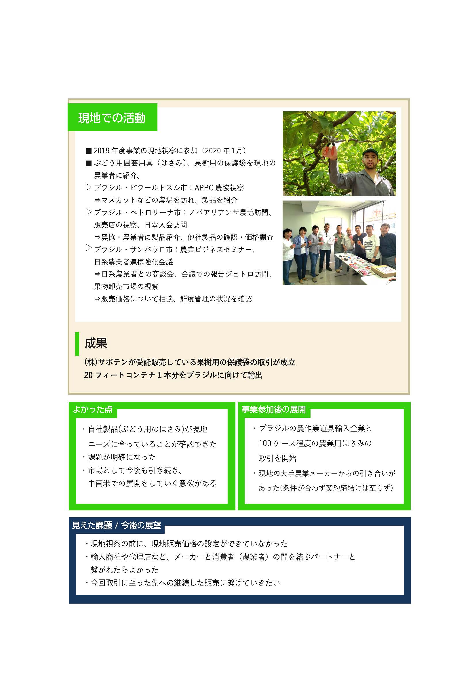 本事業で行った訪日研修で農業展示会を訪問し、サボテン社のはさみを試したブラジルの果樹⽣産者からサボテン商品を望む声が上がり、現地視察へ参加していただきました。現地視察では流通経路の確⽴までには至りませんでしたが、ブラジル農協との果樹⽤保護袋の取引が成⽴に繋がりました。