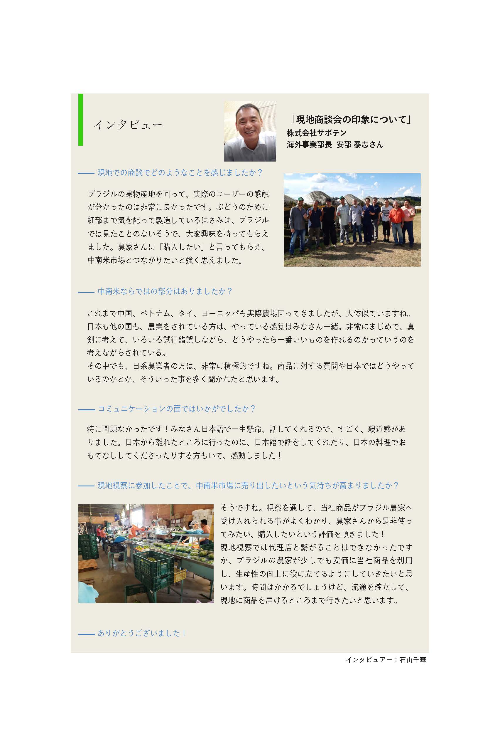 本事業では過年度事業より、日本企業と中南米日系農業者とのビジネス交流に取り組み、ビジネス創出を目的としたマッチングの場を提供してきました。日本と中南米の距離の遠さから、実際の取引に繋がる事例は決して多くはないですが、その中でも取引に繋がった好事例について、インタビュー形式でのフォローアップ調査を行い、成果や今後の展望について取りまとめました。中南米への展開を目指している企業にとっての参考資料として、ご覧いただけたらと思います。