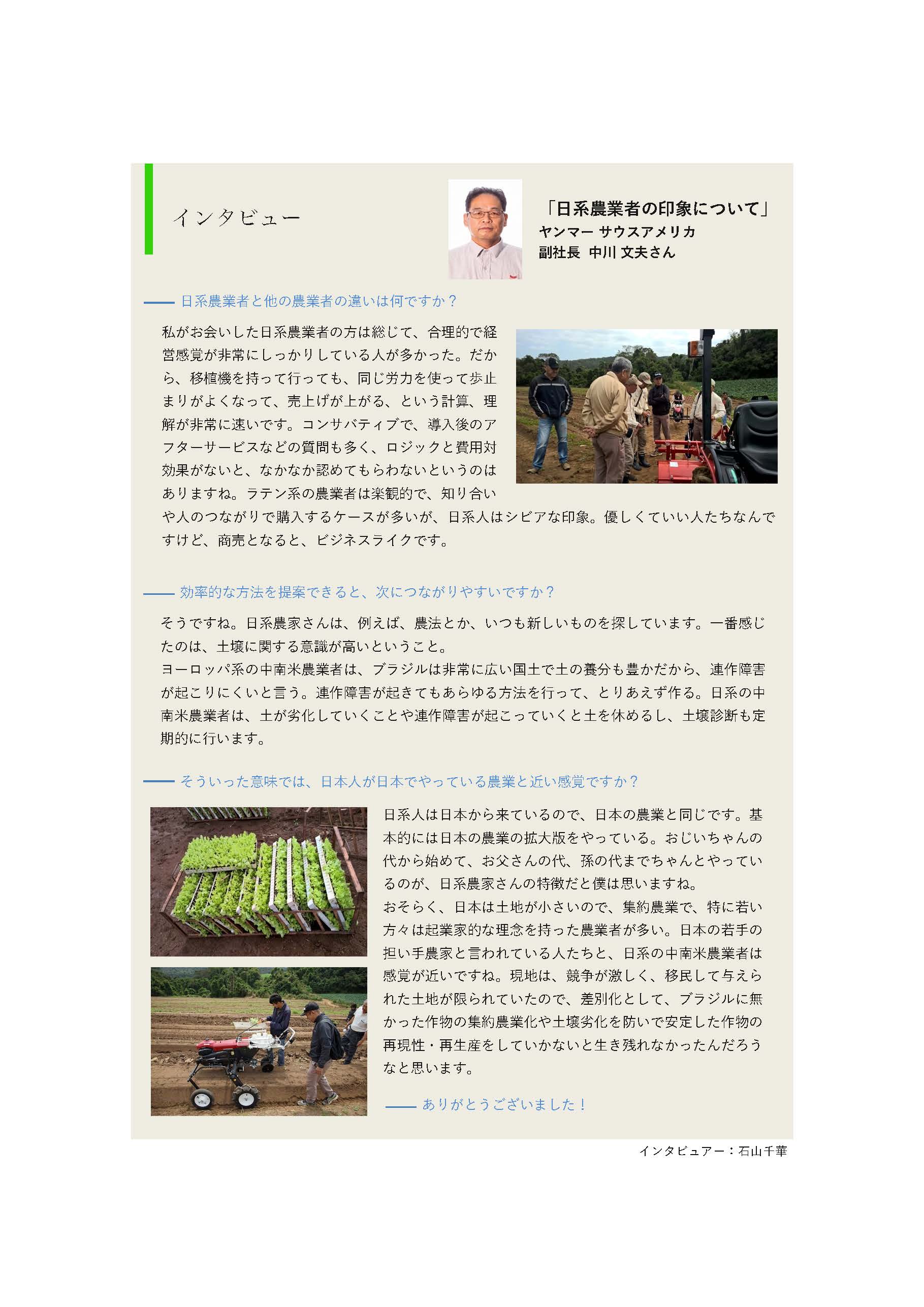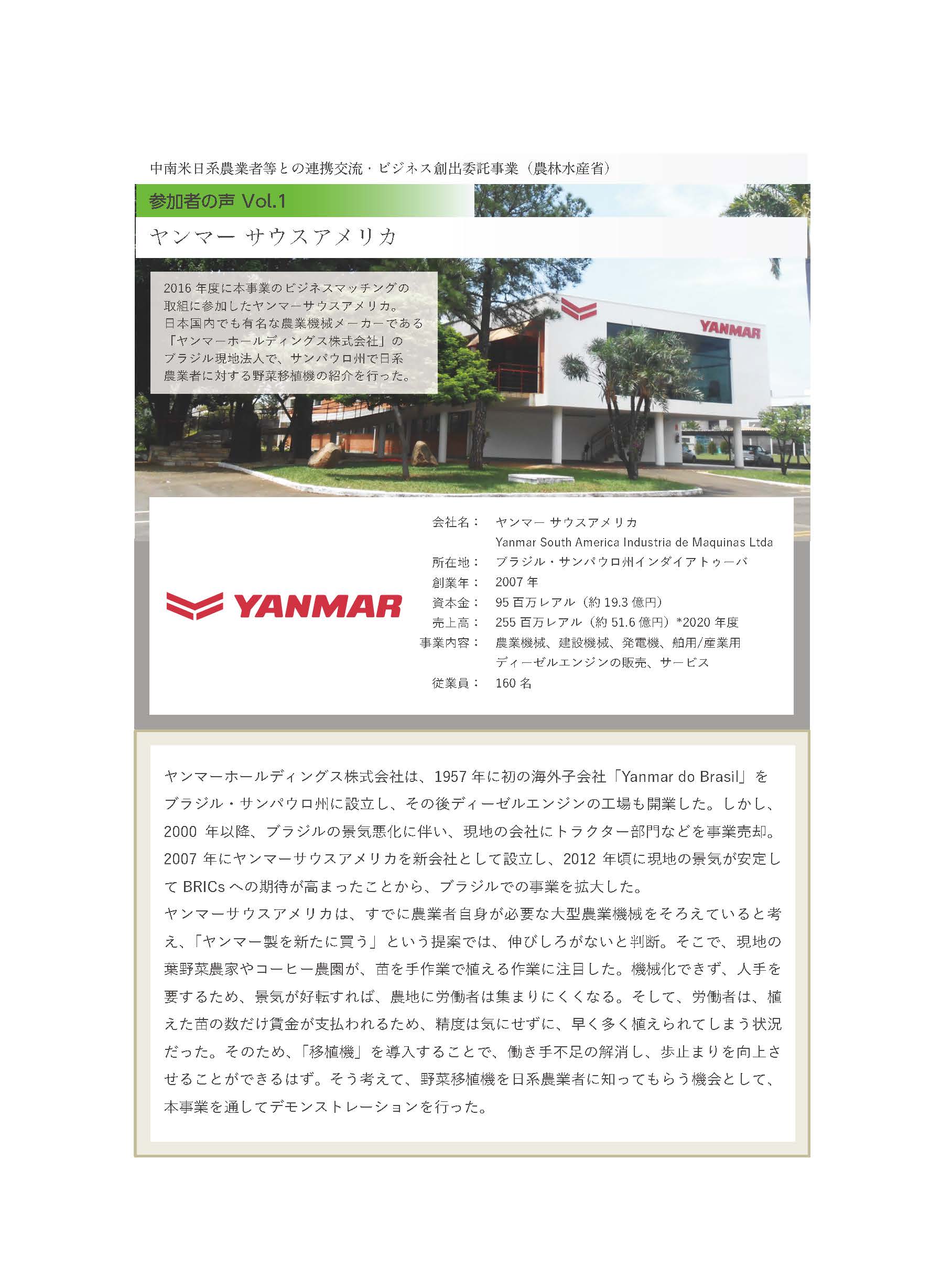 2016年度に本事業のビジネスマッチングの取組に参加したヤンマーサウスアメリカ。⽇本国内でも有名な農業機械メーカーである「ヤンマーホールディングス株式会社」のブラジル現地法人で、サンパウロ州で日系農業者に対する野菜移植機の紹介を行った。
