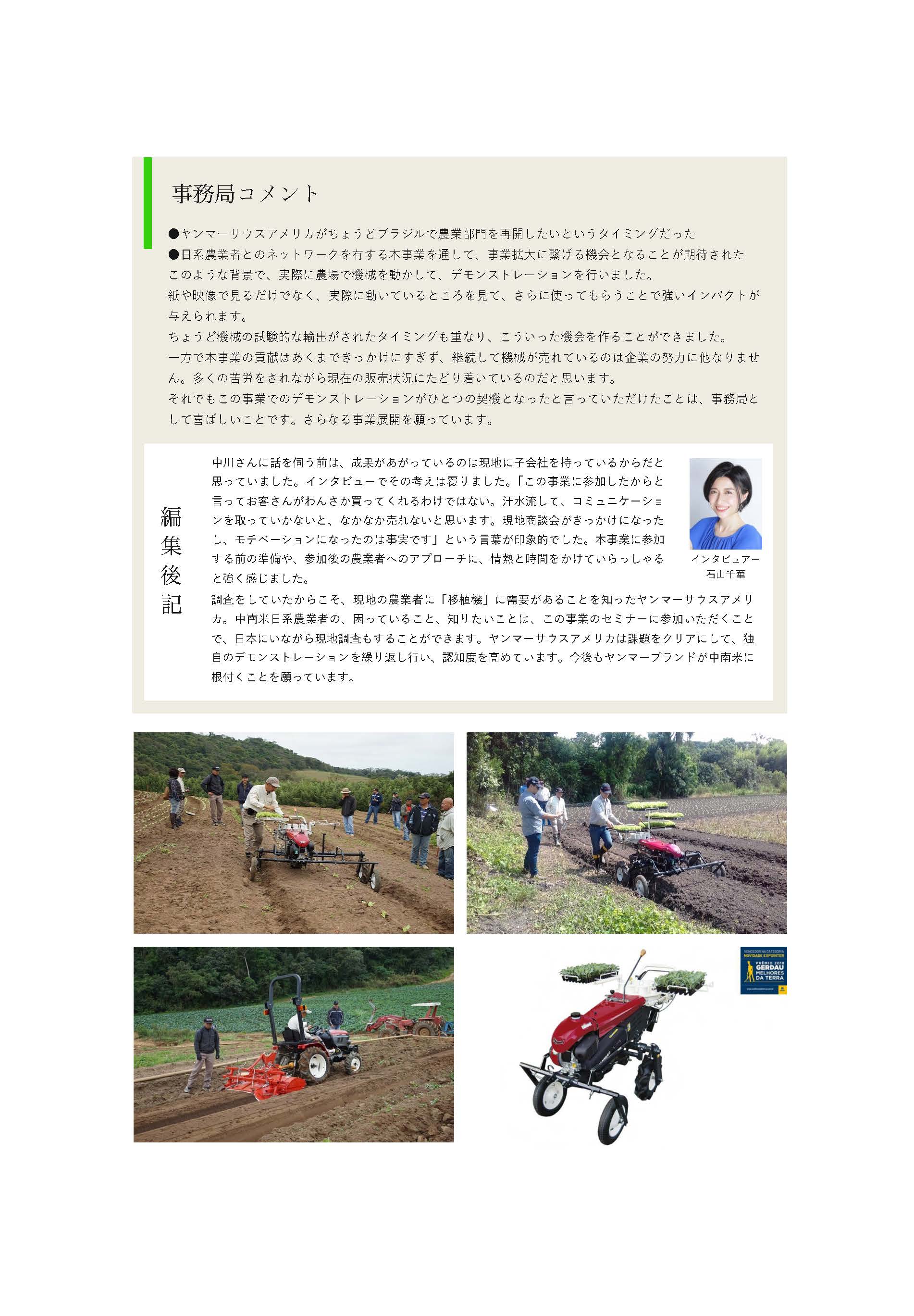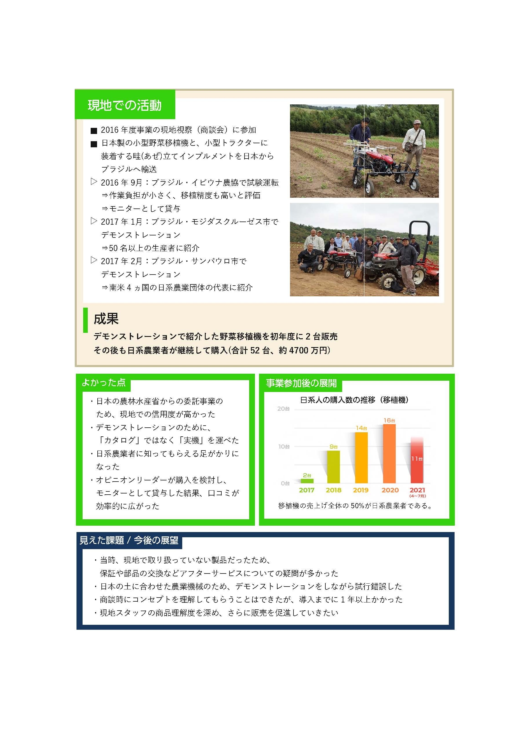 ⽇系農業者とのネットワークを有する本事業を通して、ヤンマーサウスアメリカ社が⼩型野菜移植機のデモンストレーションを実施しました。企業努力の成果であることはもちろんですが、このデモンストレーションがひとつの契機となって、現在まで日系農業者による購入が増加傾向にあります。